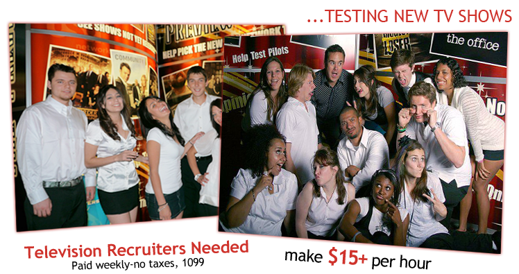 PILOT SEASON RECRUITERS. Each of the sixty recruiters hired will work with a team of at least three other recruiters in a high-traffic location inside one of the major resorts on Las Vegas Blvd. Each location will have large signage and displays designed to add hype and create a buzz. Recruiters are utilized to engage tourists as they walk by, determine their eligibility, then inform them if they qualify to view a sneak preview of a never-before-seen television pilot. Since we pay cash, most tourists are eager to participate. (We pay between $10-$35 per show). Some tourists also want to participate for the "experience". (The experience provides a unique opportunity for participants to share their opinions with the networks, while assisting in the fate of a new TV show). The total process usually takes less than an hour, and most people really enjoy the experience.